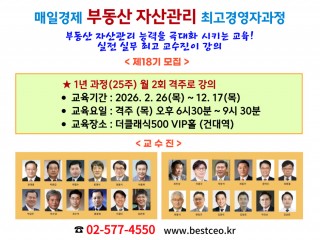 매일경제 부동산 자산관리 최고경영자과정 제18기 모집요강 ▣ 모집인원 : 40명 ▣ 교육기간 : 2026년 2월 26일(목) ~ 12월 17일(목), 1년 과정 (25주) ▣ …