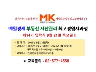 매일경제 부동산 자산관리 최고경영자과정 제14기 모집요강 ▣ 모집기수 : 제 14기 ▣ 모집인원 : 40명 ▣ 교육기간 : 2023년 9월 21일(목) ~ 2024년 1월 18일(…